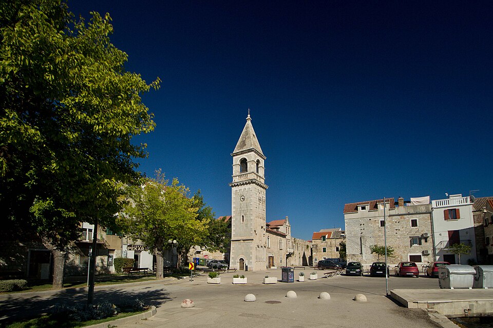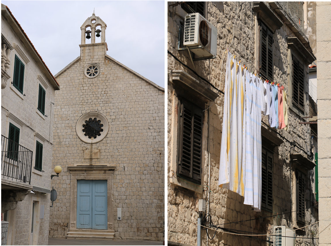 Slenter ook eens door de steegjes achter de promenade, bezoek de kerk... Kuier eens naar het pleintje van Kaštel Stari. Jammer hoe verlaten en onderkomen het er nu uitziet (2025) Jaren geleden kon je hier nog terecht voor wat vers fruit of een moot vis van het marktje daar.