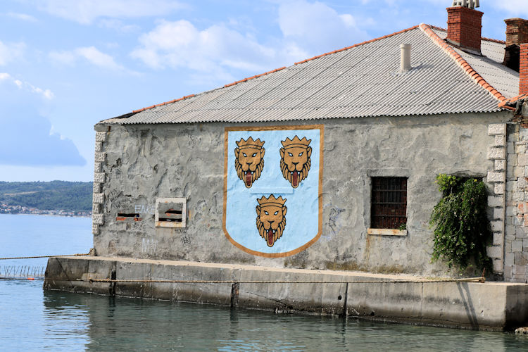 We nemen nog een kijkje bij de achterkant van het oude pakhuis en de wijnmakerij. Op de muur zie je deze afbeelding, die het historische wapenschild van Dalmatië toont. Dit hele gebouw is beschermd cultureel erfgoed.