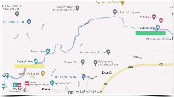 Op wandel afstand van het stadje (wandelpad nummer 713 vanuit Pazin) vind je een prachtige plek aan de rivier, Pazinski Krov. (geel onderstreept op de kaart)