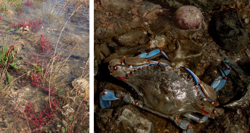 Terwijl ik terugwaad en naar de rode plantjes in het ondiepe water kijk, zie ik in een ooghoek iets blauws in het water...