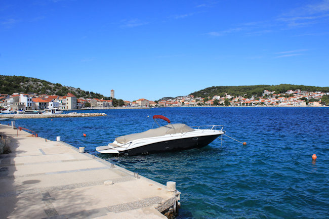 In Betina konden we het water niet in. De zee beukte er genadeloos tegen de pier aan. Dus trokken we richting Murter via de "Petra Preradovića"-straat.