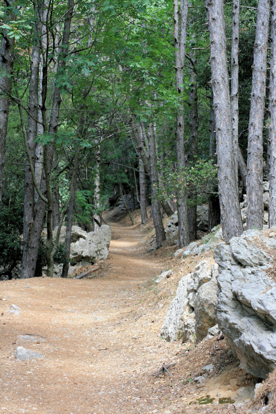 Eigenlijk wijst het pad zichzelf uit met witte geschilderde lijnen op rotsen met daartussen een rode pijl. Al wordt het algauw moeilijker begaanbaar op sommige plaatsen door de losse stenen en rotsen.